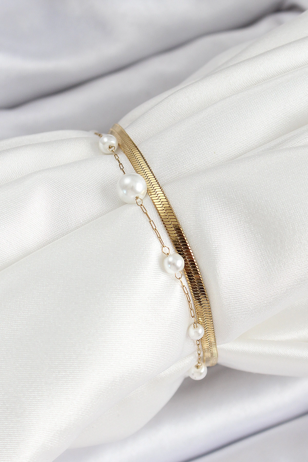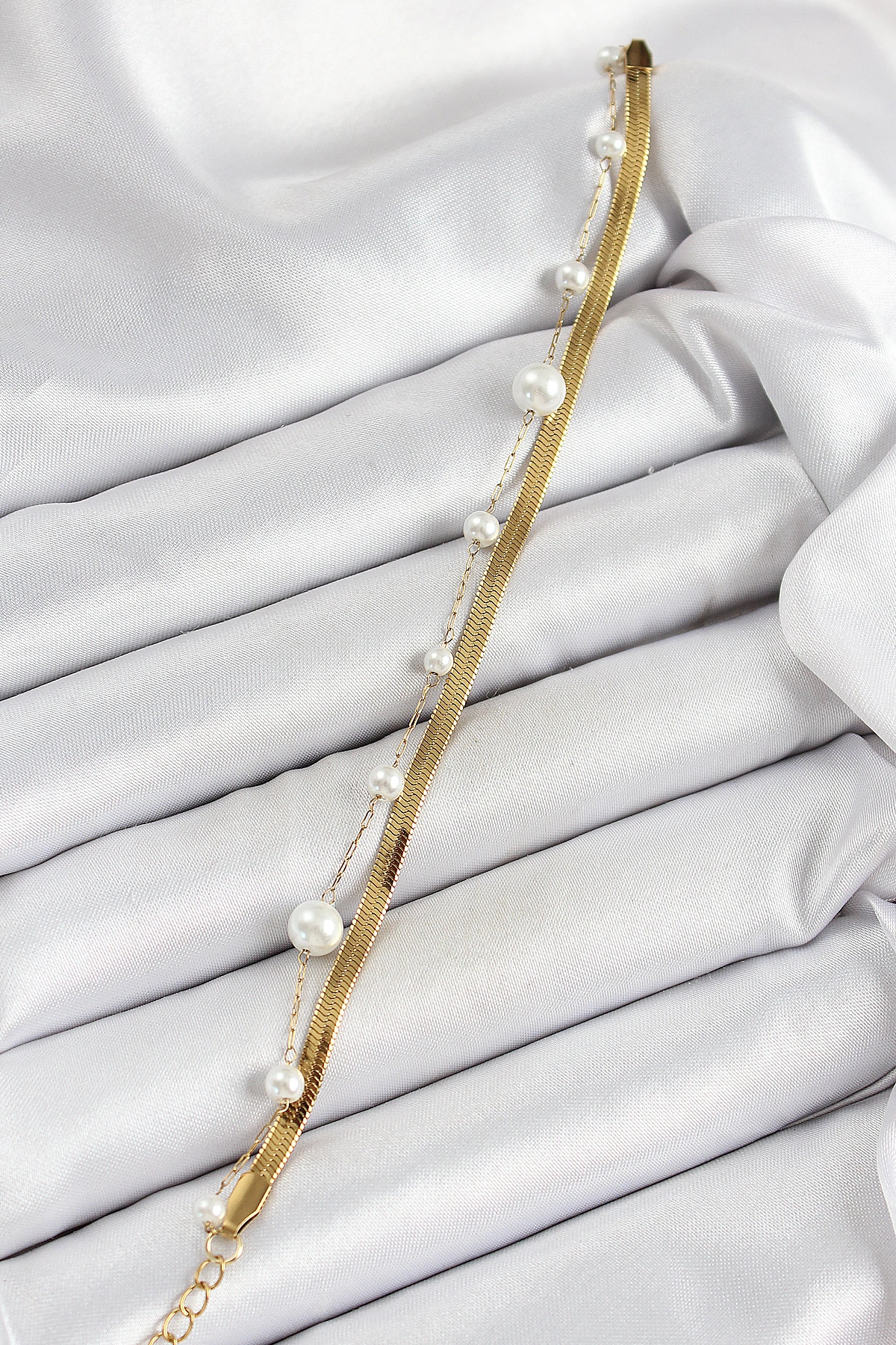 316L Çelik Gold Renk İncili ve İtalyan Zincirli Kadın Bileklik