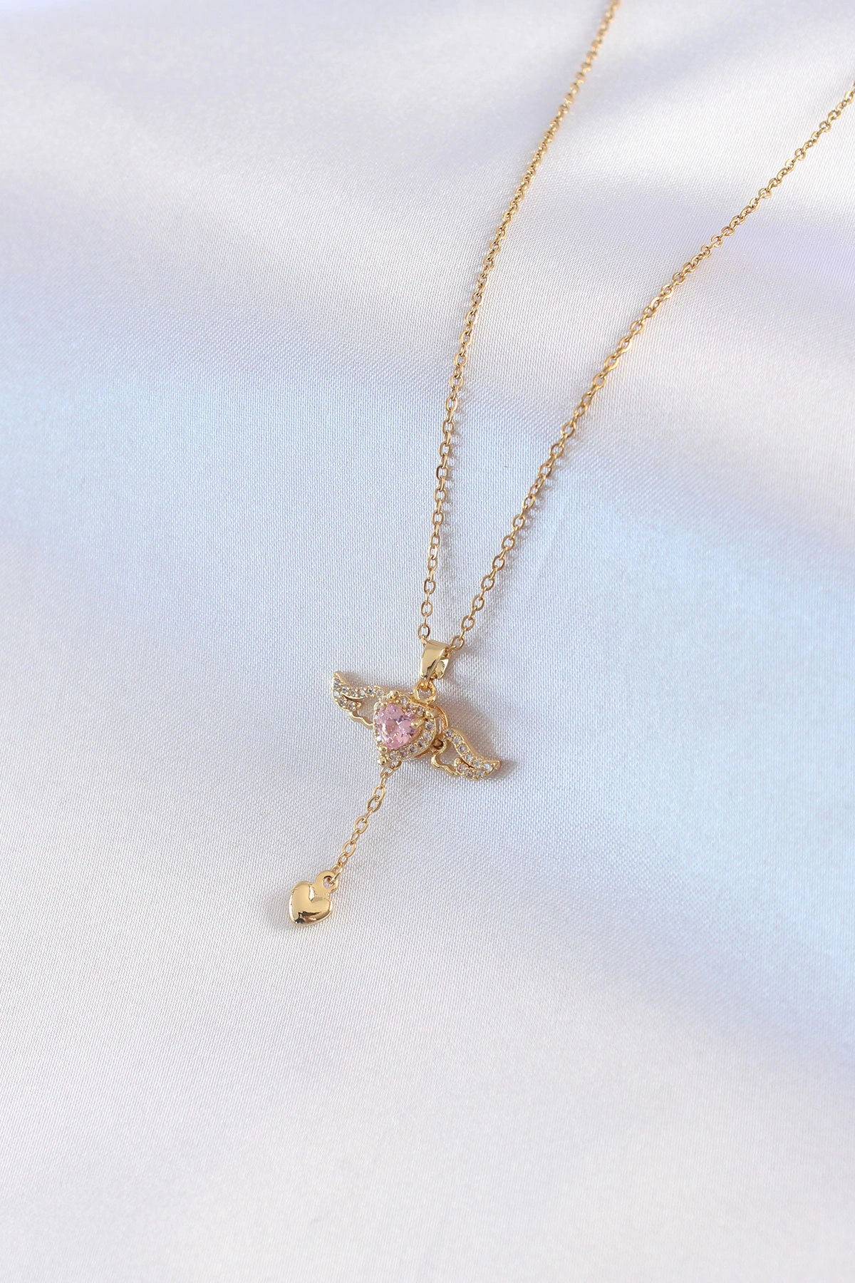 316L Çelik Gold Renk Kanatlı Kalp Model Zirkon Taş Detay Kadın Kolye