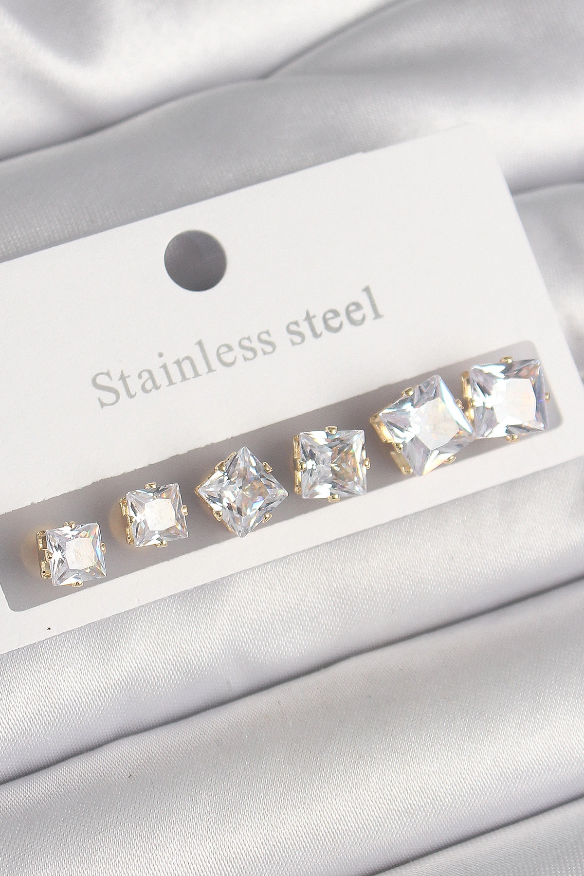 316L Çelik Gümüş Renk Kare Zirkon Taşlı Kadın Küpe Seti