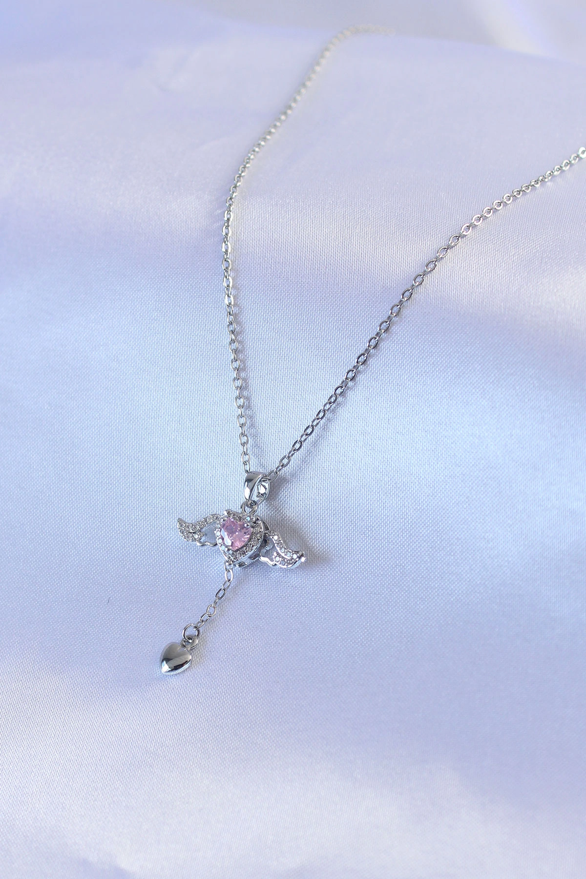 316L Çelik Gümüş Renk Kanatlı Kalp Figür Zirkon Taş Detay Kadın Kolye