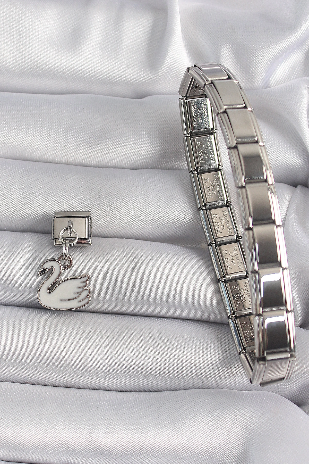 316L Çelik Gümüş Renk Sallantı Beyaz Kuğu Model Nomination Charm
