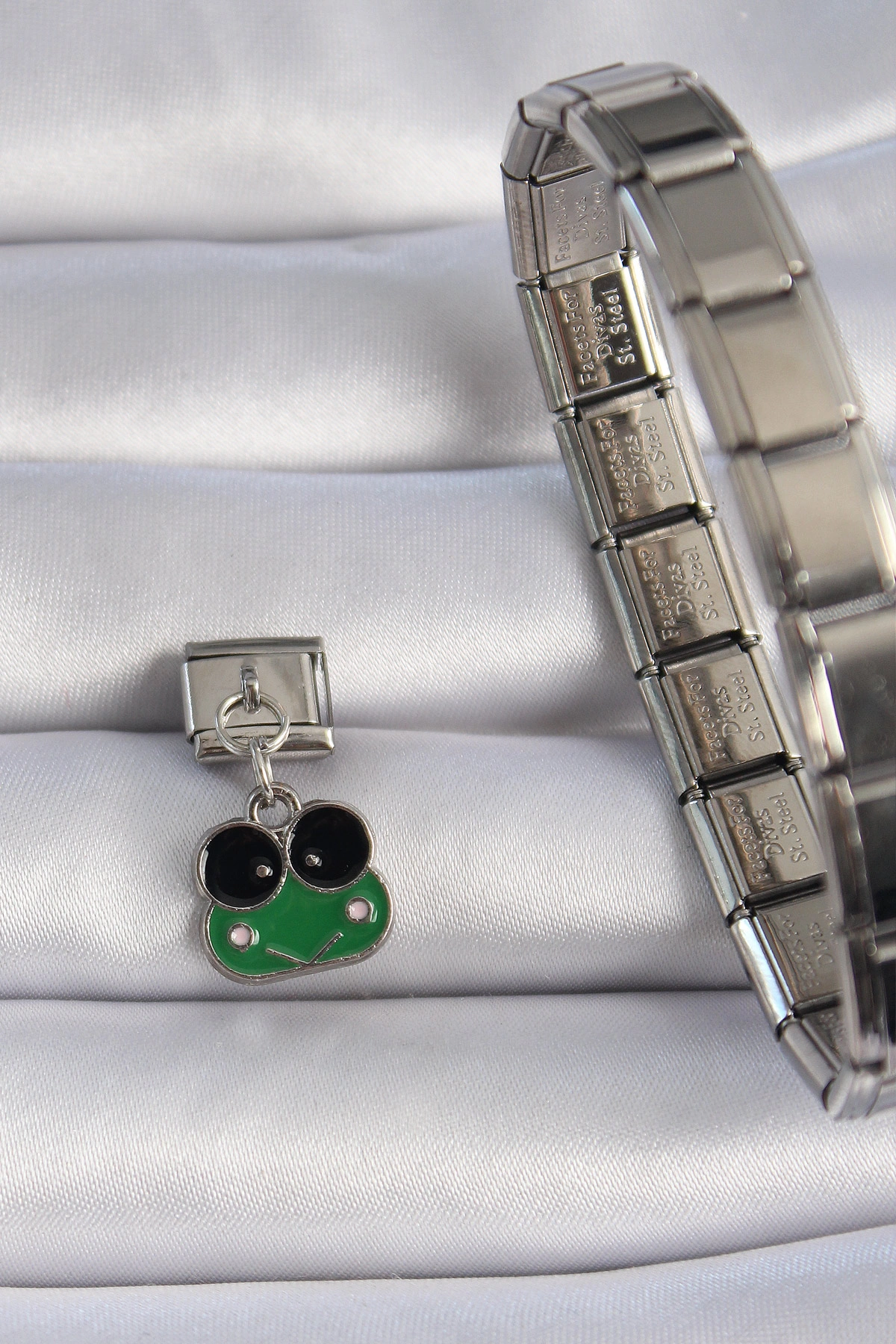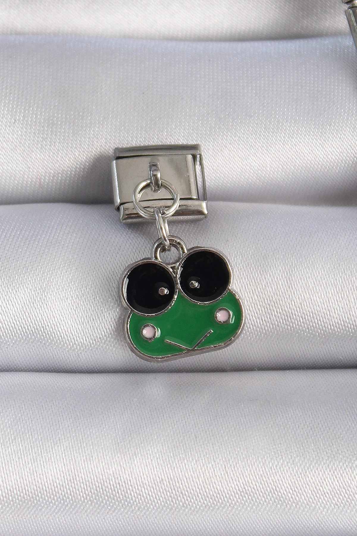316L Çelik Gümüş Renk Sallantılı Yeşil Kurbağa Figür Nomination Charm