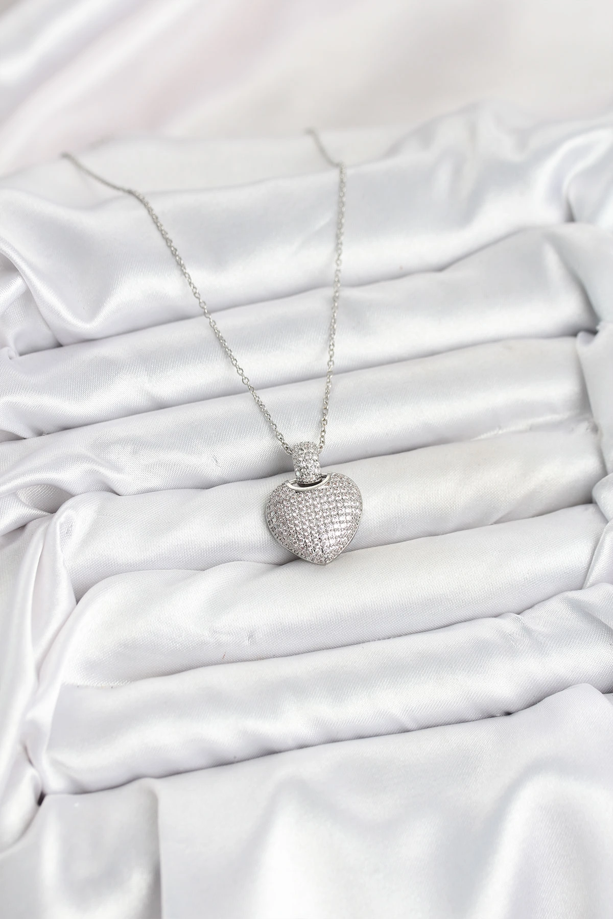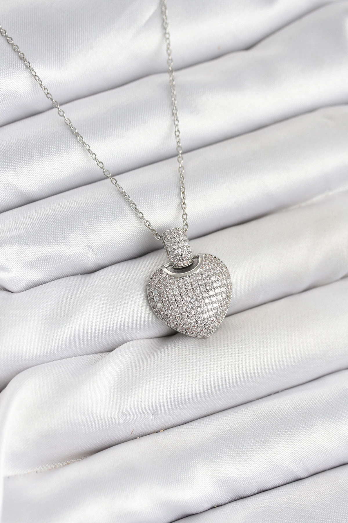 316L Çelik Zincir Gümüş Zirkon Taşlı Kalpli Kadın Kolye