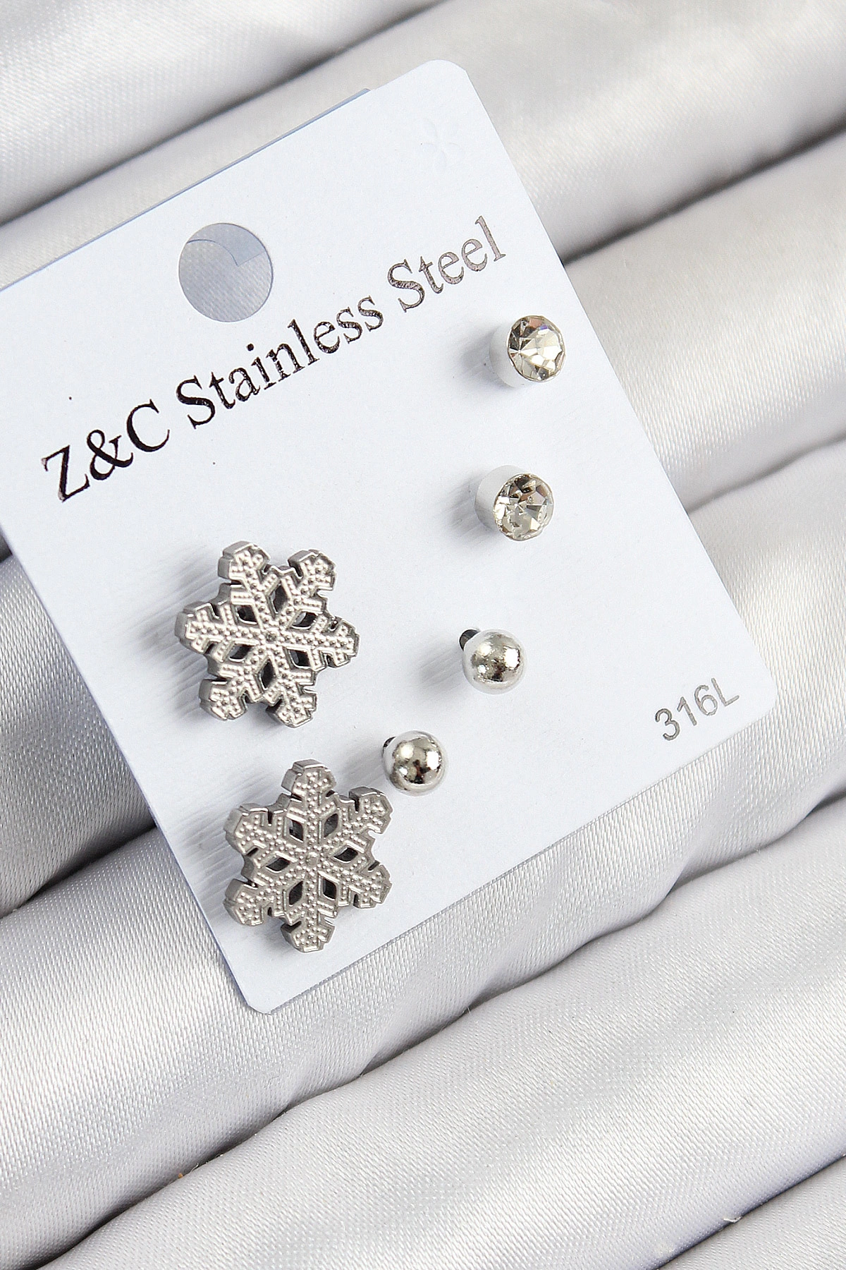 316L Çelik Zirkon Taşlı Kar Tanesi Model Gümüş Renk Kadın Set Küpe