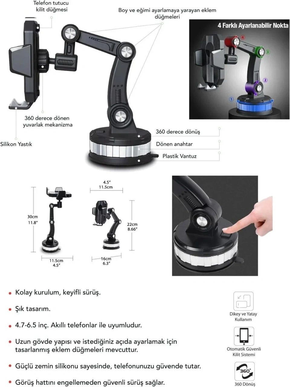 360 Derece Dönebilen Ayarlanabilir Araç Içi Vantuzlu Telefon Tutucu