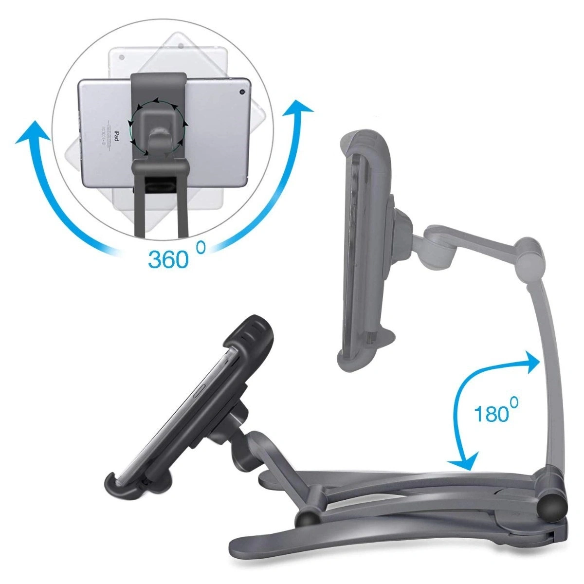 Telefon Tablet Tutucu ayrıca 360 derece dönebilir ve ihtiyaç duyulan herhangi bir görüş açısını veya pozisyonunu elde etmek için dönebilen bir standa sahiptir.