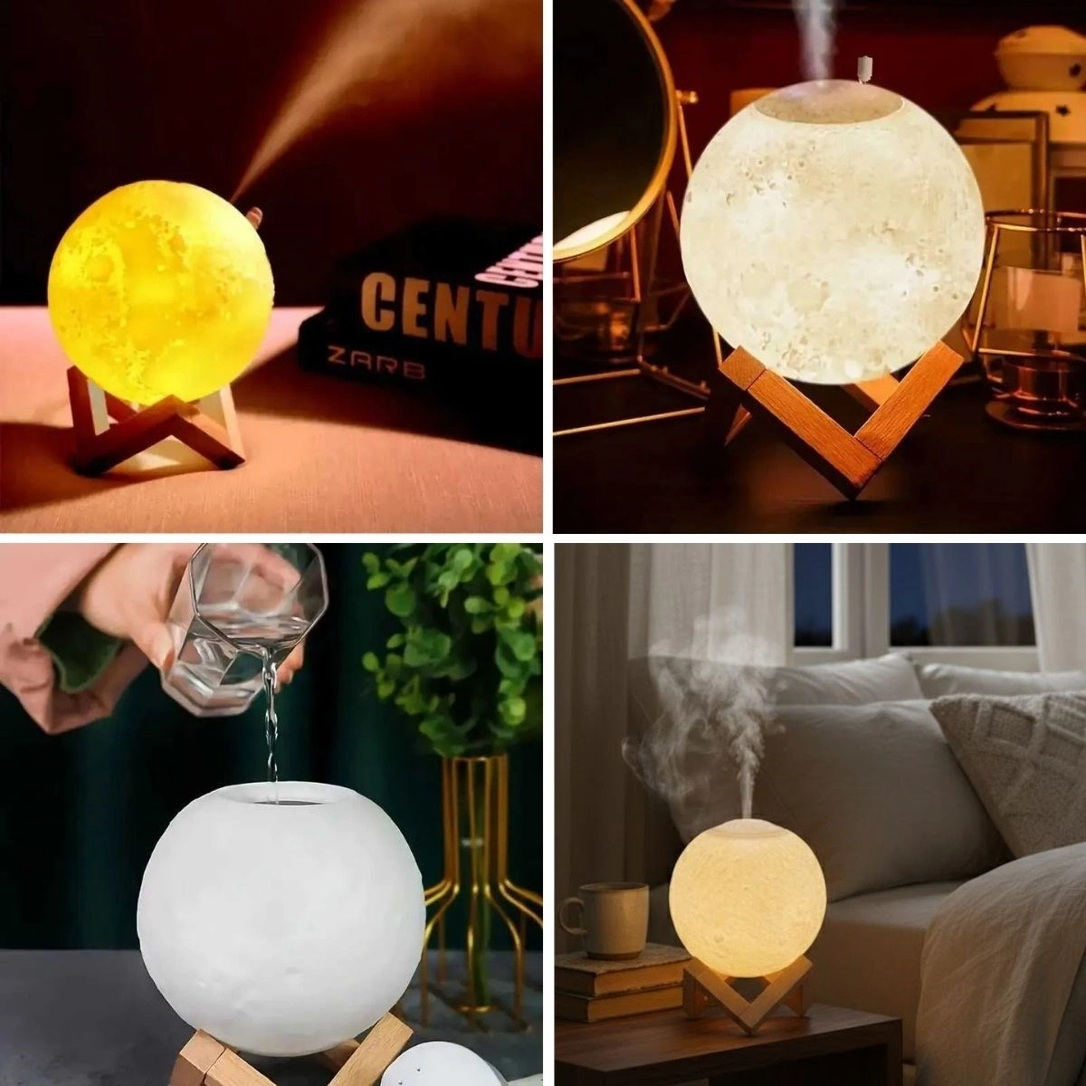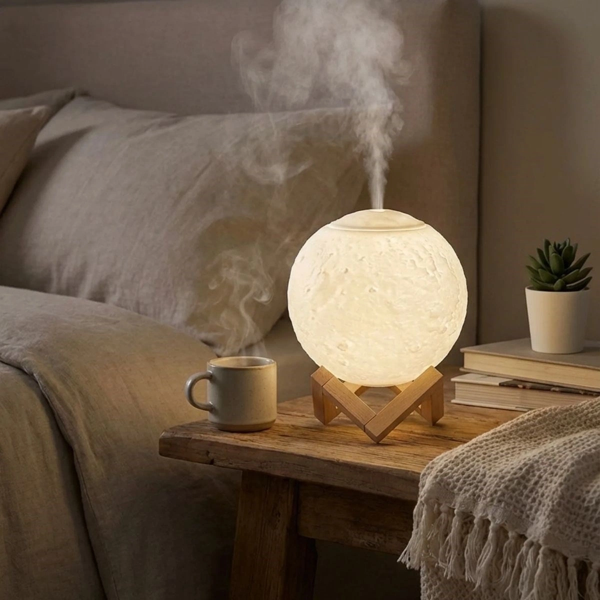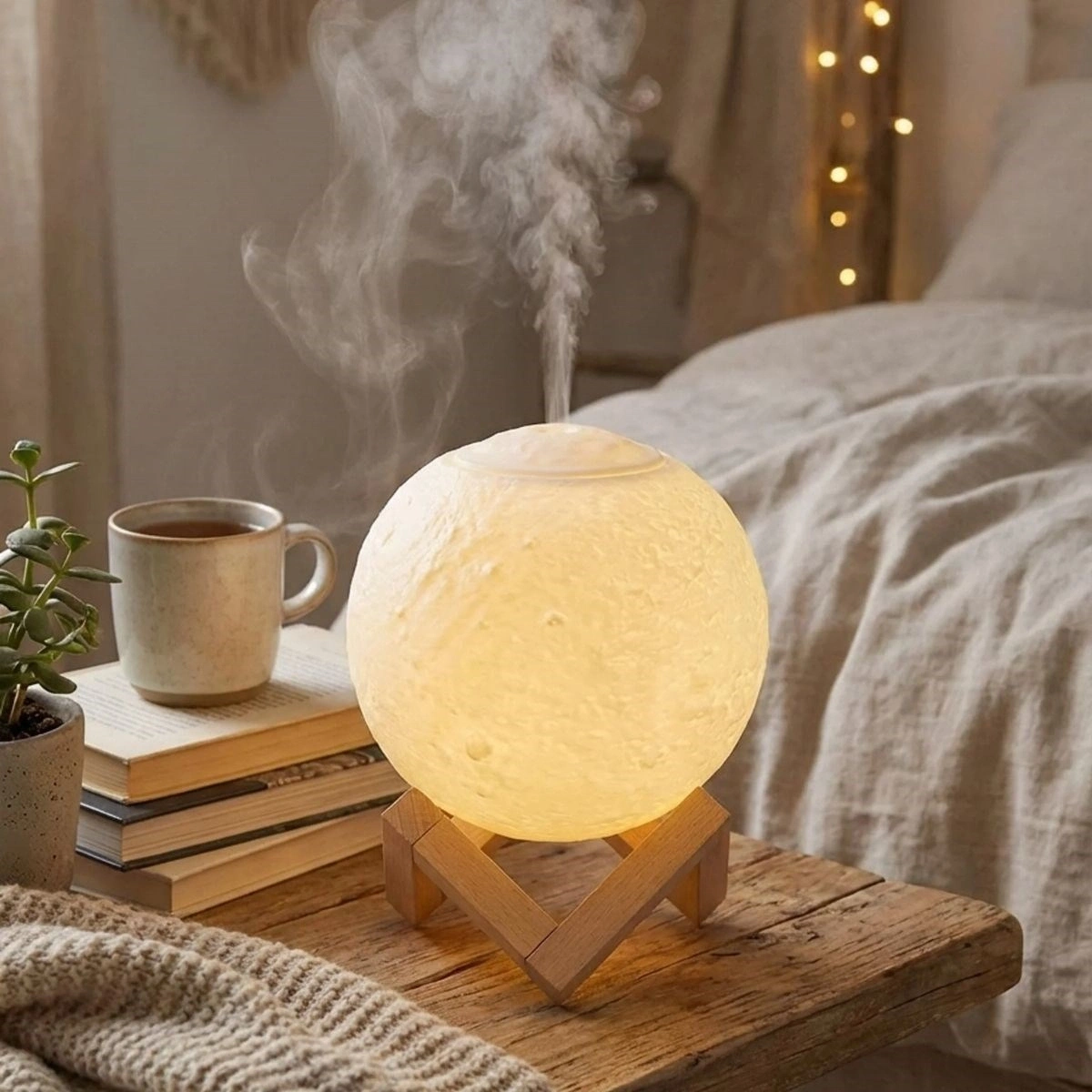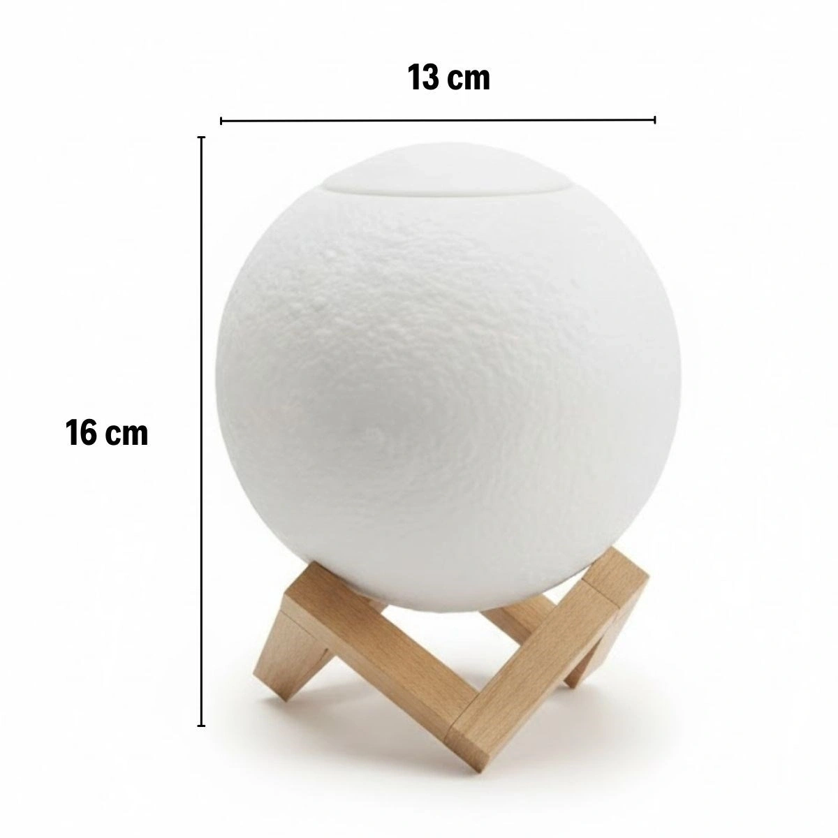 3D ay küre tasarımı sayesinde loş ortamda büyüleyici bir ambiyans oluşturur. Ahşap standı ile birlikte modern ve doğal bir dekoratif görünüm sunar.
