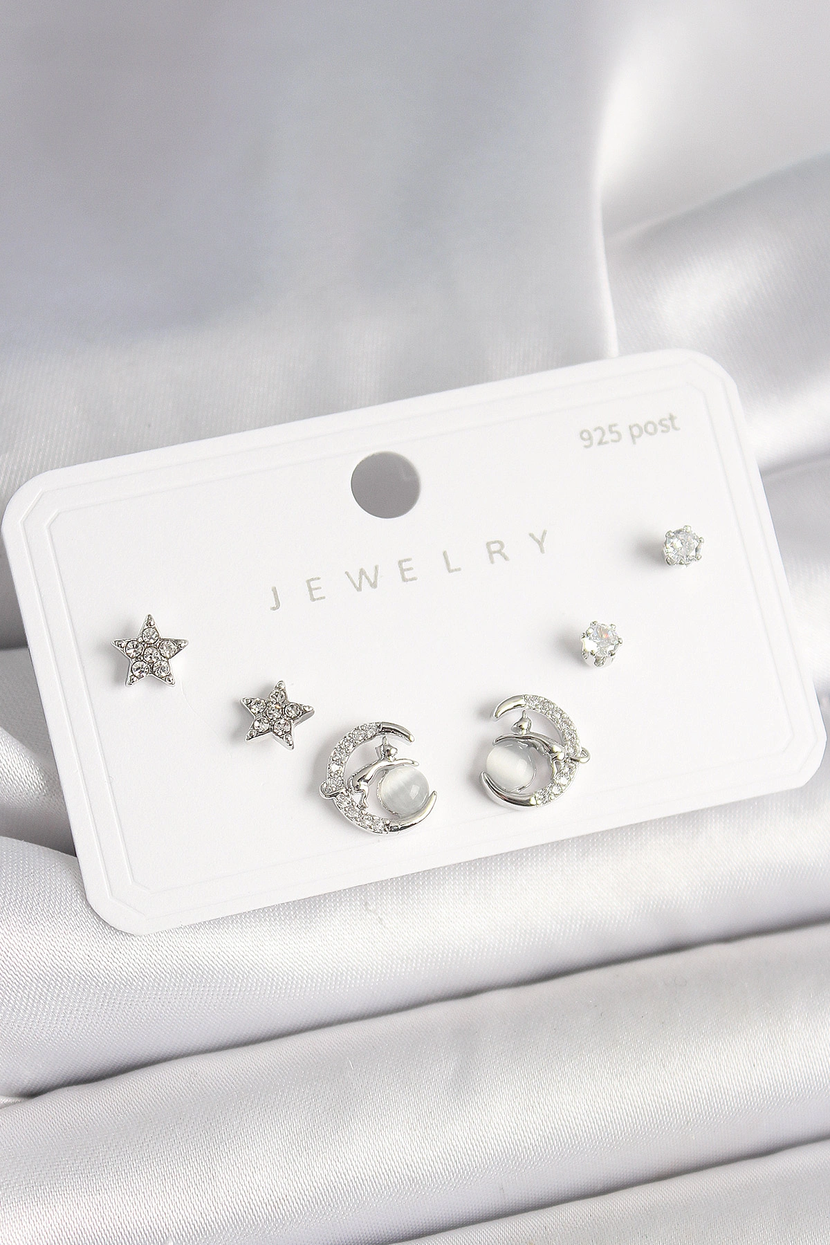 925 Ayar Gümüş Çivi Zirkon Taşlı Hilal Yıldız Model Kadın Küpe Seti