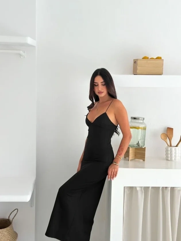 Askılı Uzun Elbise V Yaka Şık Gece Elbisesi Vücuda Oturan - Siyah