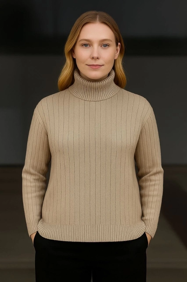 Balıkcı Yaka Bağazlı Triko Kazak Pamuklu Kalın Fitilli Dokuma - Bej
