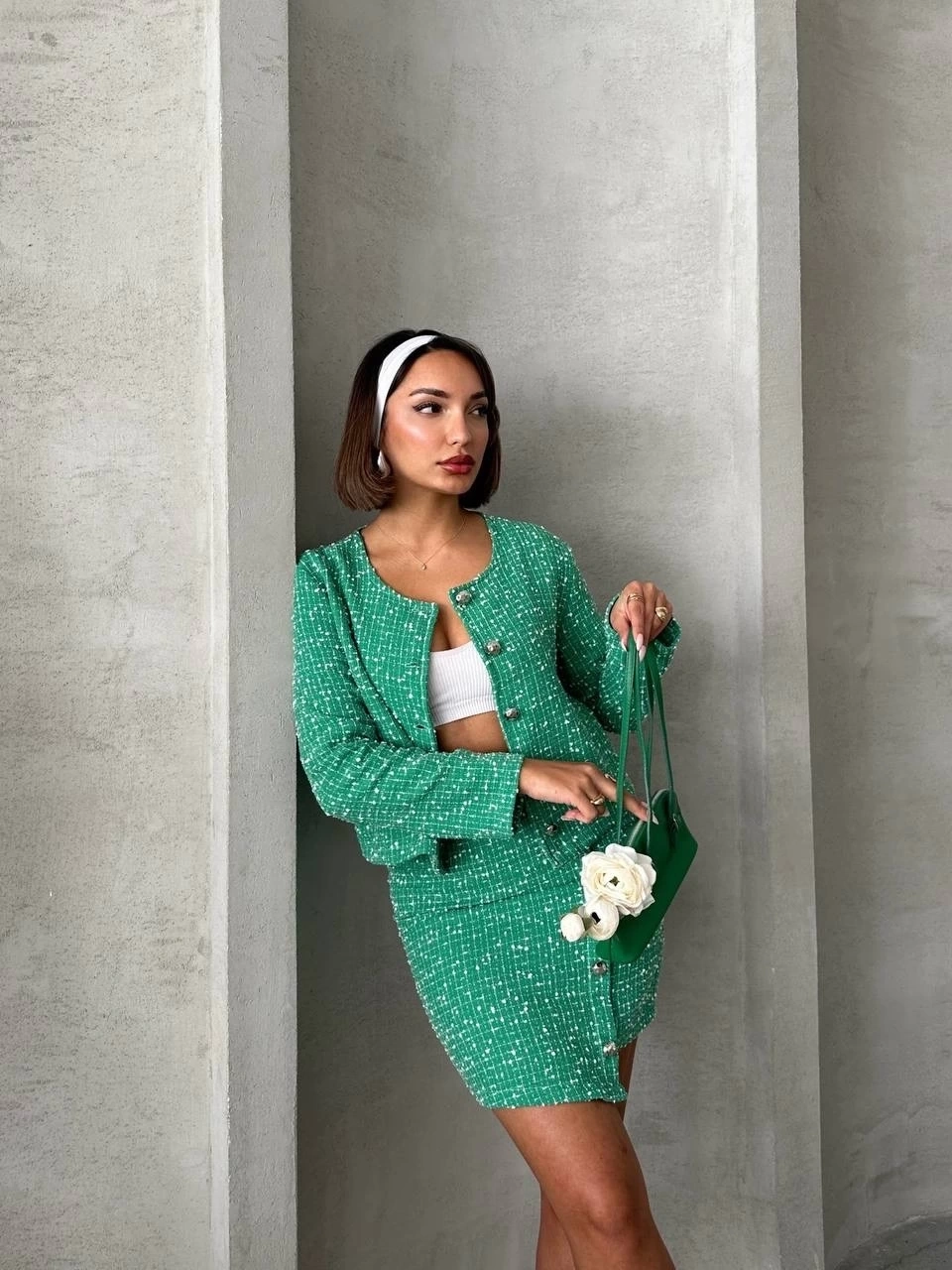 Modaya uygun ve tarz sahibi bir görünüm elde etmek isteyen kadınların tercihi olan Ceketli Etek Takım CHL Kumaş Yeşil H24443, gardırobunuzun vazgeçilmez parçalarından biri olmaya aday!