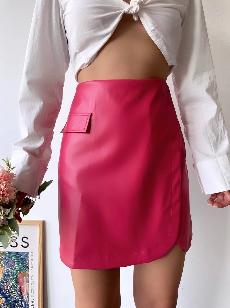 Şıklığı ve zarafeti bir arada sunan Cep detaylı oval kapaklı deri etek fuşya h240048, gardırobunuzun vazgeçilmez parçası olmaya aday.