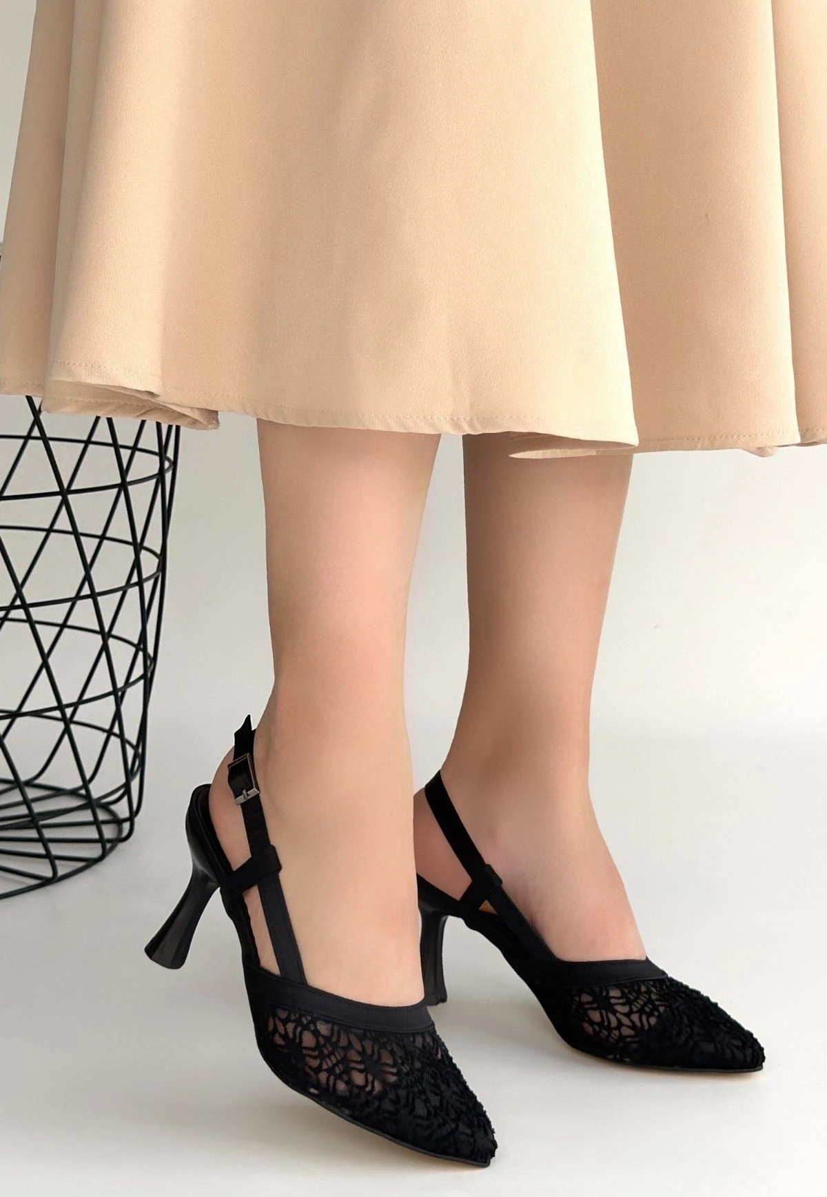 Ceta Siyah Cilt Tül Detaylı Topuklu Ayakkabı