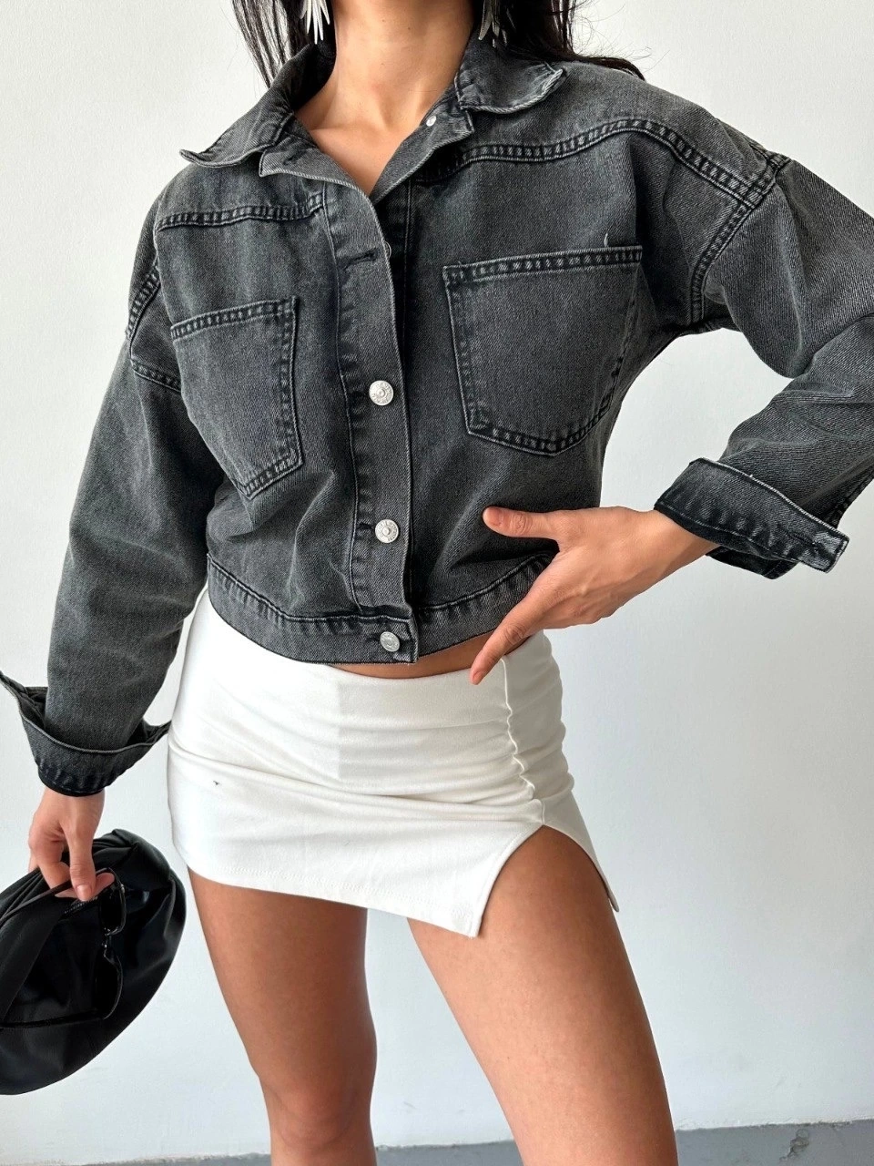 Yeni sezonda sokak modasına yön veren çift cepli kol katlamalı süper taş enzim yıkama crop kot ceket ile tarzınızı ön plana çıkarın.