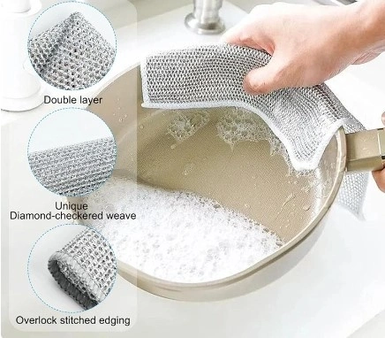 Çok amaçlı tel bulaşık bezi, bulaşıkları, lavaboları ve daha fazlasını ovalayan ve temizleyen birinci sınıf bir metal tel bulaşık yıkama bezdir.