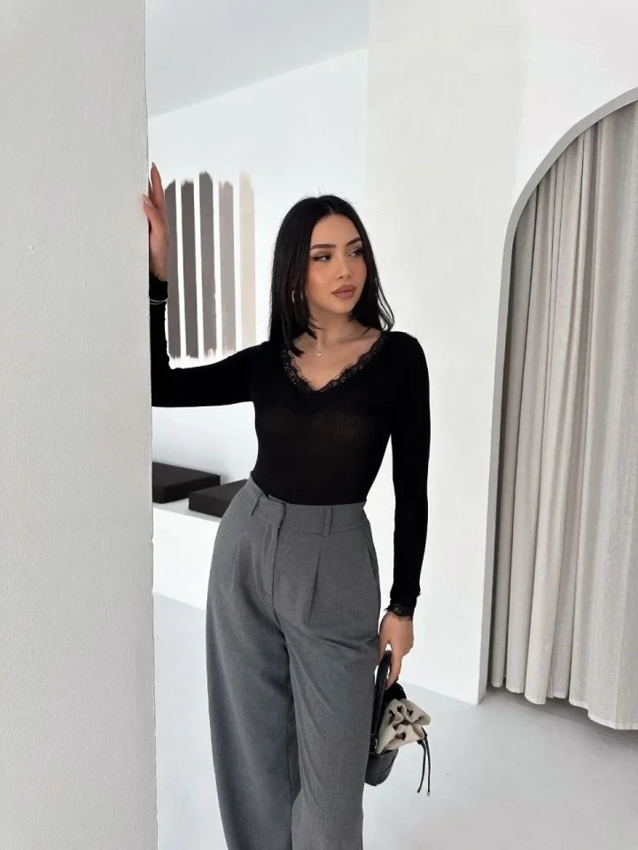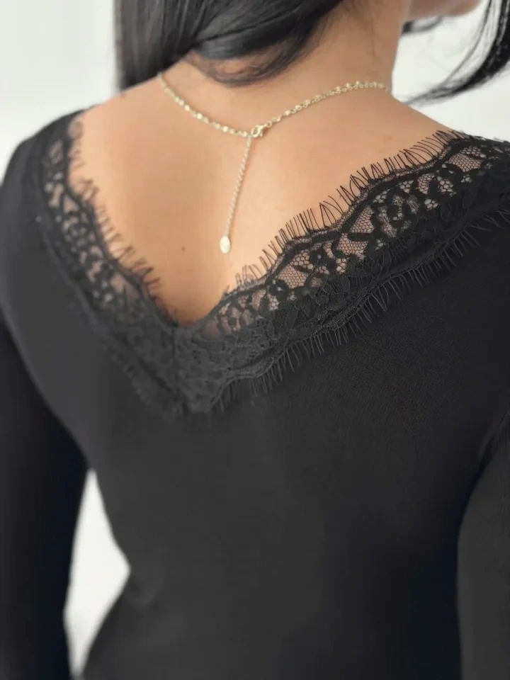 Dantel Detaylı V Yaka Arkası V Yaka Kaşmir Dokulu Uzun Kollu Bluz - Siyah