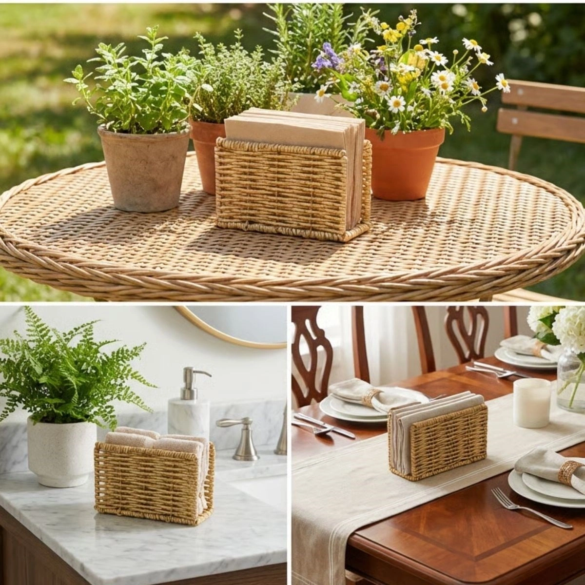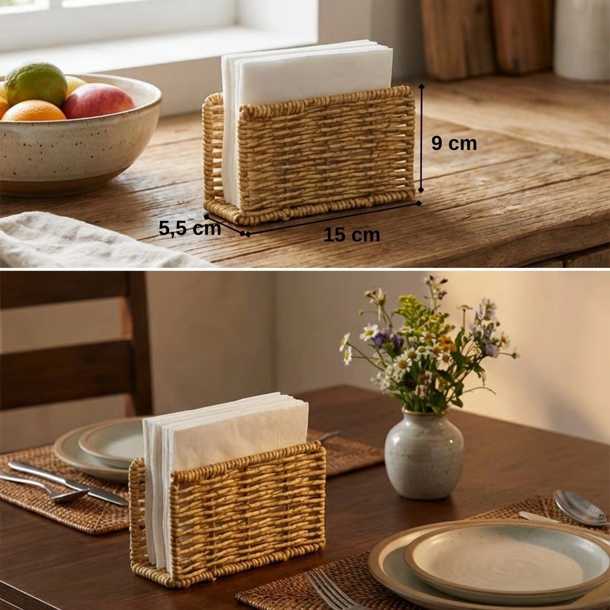 Plastik Rattan Dikdörtgen Peçetelik; estetik tasarımı, ideal ölçüleri ve fonksiyonel yapısıyla masaüstü düzenini tamamlayan şık bir aksesuardır.