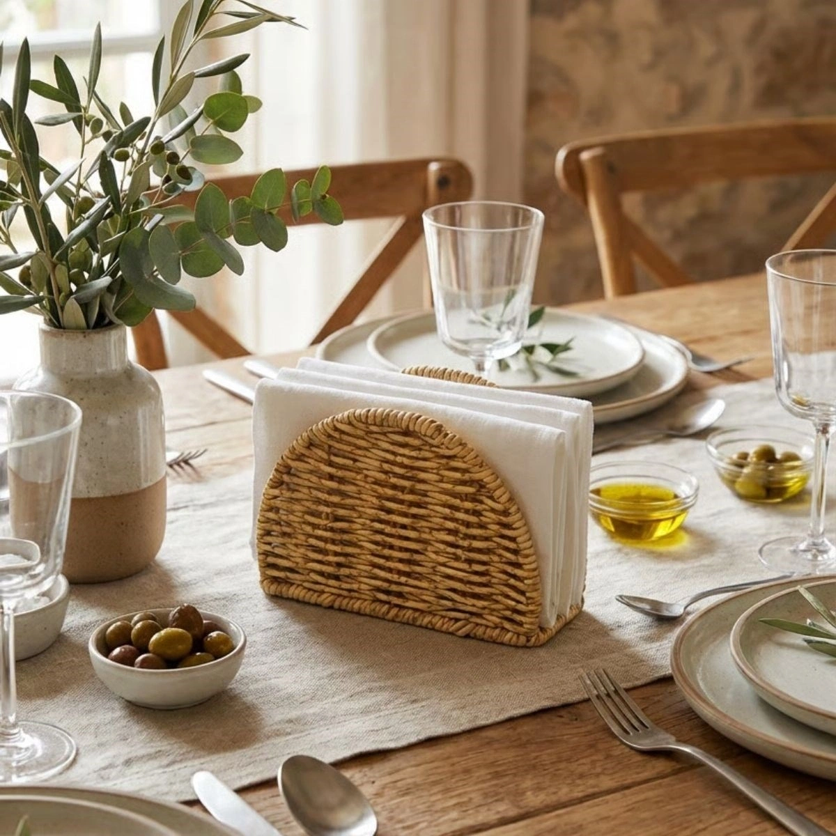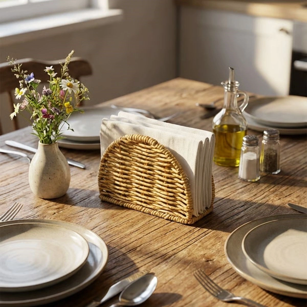 Plastik Rattan Yarım Yuvarlak Peçetelik, işlevselliği ve dekoratif görünümü bir araya getirerek masa üstlerinize düzen ve zarafet katmak için tasarlanmıştır.