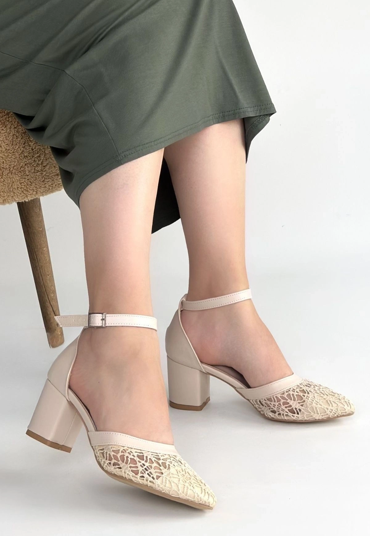 Dmop Bej Cilt Tül Detaylı Topuklu Ayakkabı