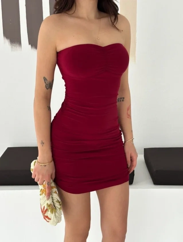 Drapeli Straplez Mini Elbise Esnek Kumaş Vücuda Oturan Gece Elbisesi - Bordo
