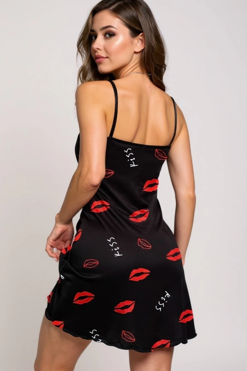 Dudak Desenli Siyah Askılı Gecelik