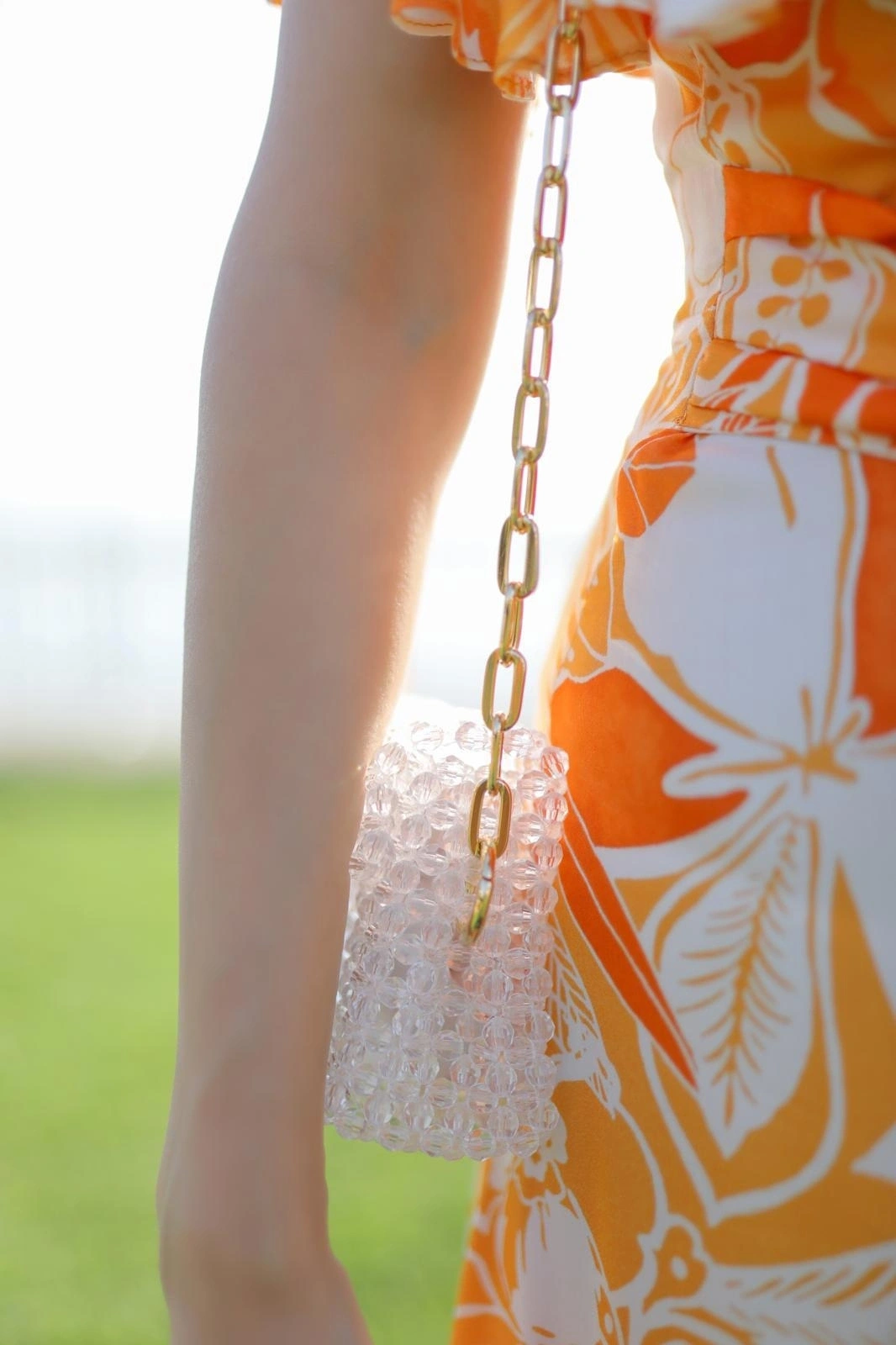 Beyaz rengin zarafetiyle buluşan el yapımı zincirli incili çanta ile şıklığınızı tamamlayın.