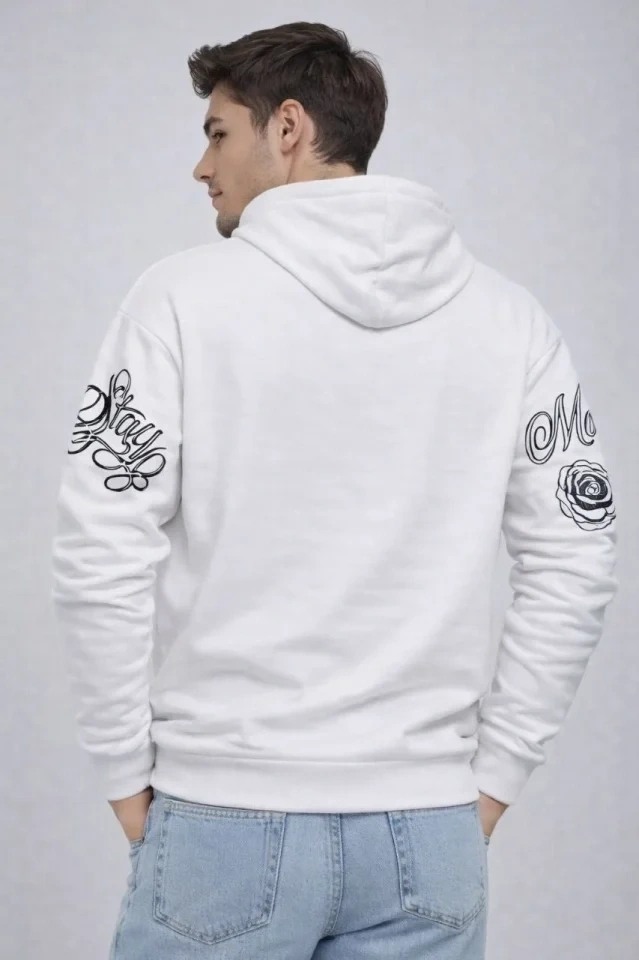 Erkek 3 İplik Pamuklu Kapüşonlu Baskılı SweatShirt Hoodie - Beyaz