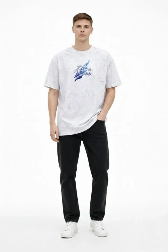 Erkek Asit Yıkamalı Oversize Tişört Future Worlds Baskılı Bisiklet Yaka Kısa Kollu Streetwear %100 Pamuk Street Style T-Shirt - Beyaz