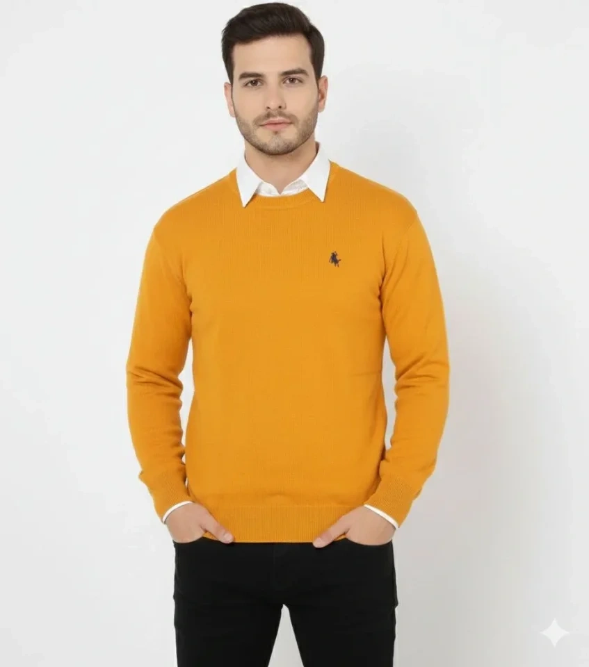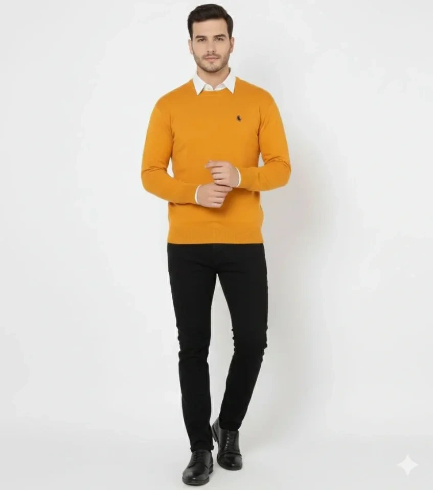 Erkek Bisiklet Yaka Nakış Işlemeli Triko Kazak Yumuşak Dokulu Pamuklu Ince Dokuma, Uzun Kollu Rahat Regular Kalıp - Turuncu