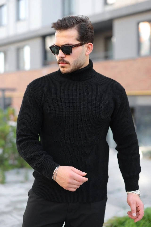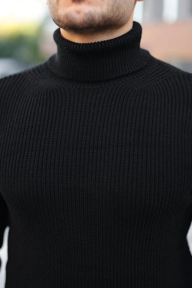 Erkek Yarım Boğaz Triko Kazak Yumuşak Dokulu Pamuklu Ince Dokuma, Uzun Kollu Rahat Regular Kalıp - Siyah