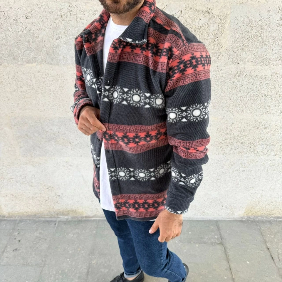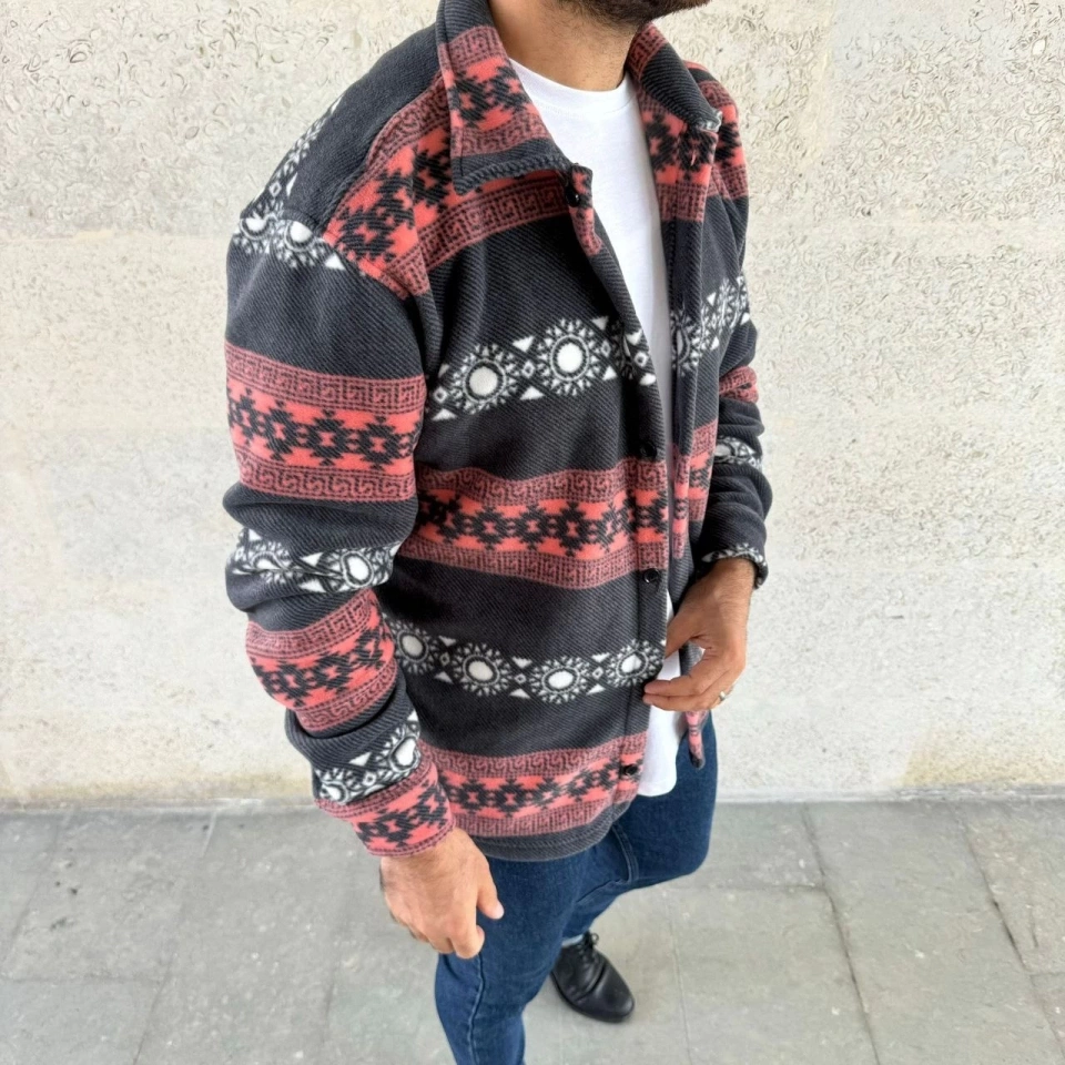 Erkek Desenli Polar Gömlek – Etnik Şerit Desen Yakalı, Uzun Kollu, Düğmeli, Oversize Rahat Kalıp - Füme