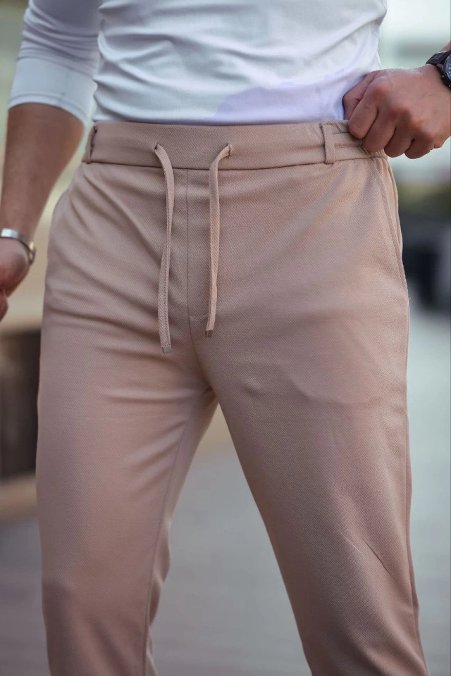 Erkek Diagonel Mikro Dokulu Cepli Pantolon - Bej