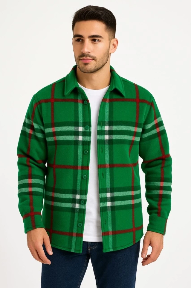 Erkek Pelüş Polar Hırka Gömlek – Yakalı, İlik Düğmeli, Göğüs Cepli, Yumuşak Dokulu Kışlık Regular Fit Rahat Günlük Model - Çimen Yeşili