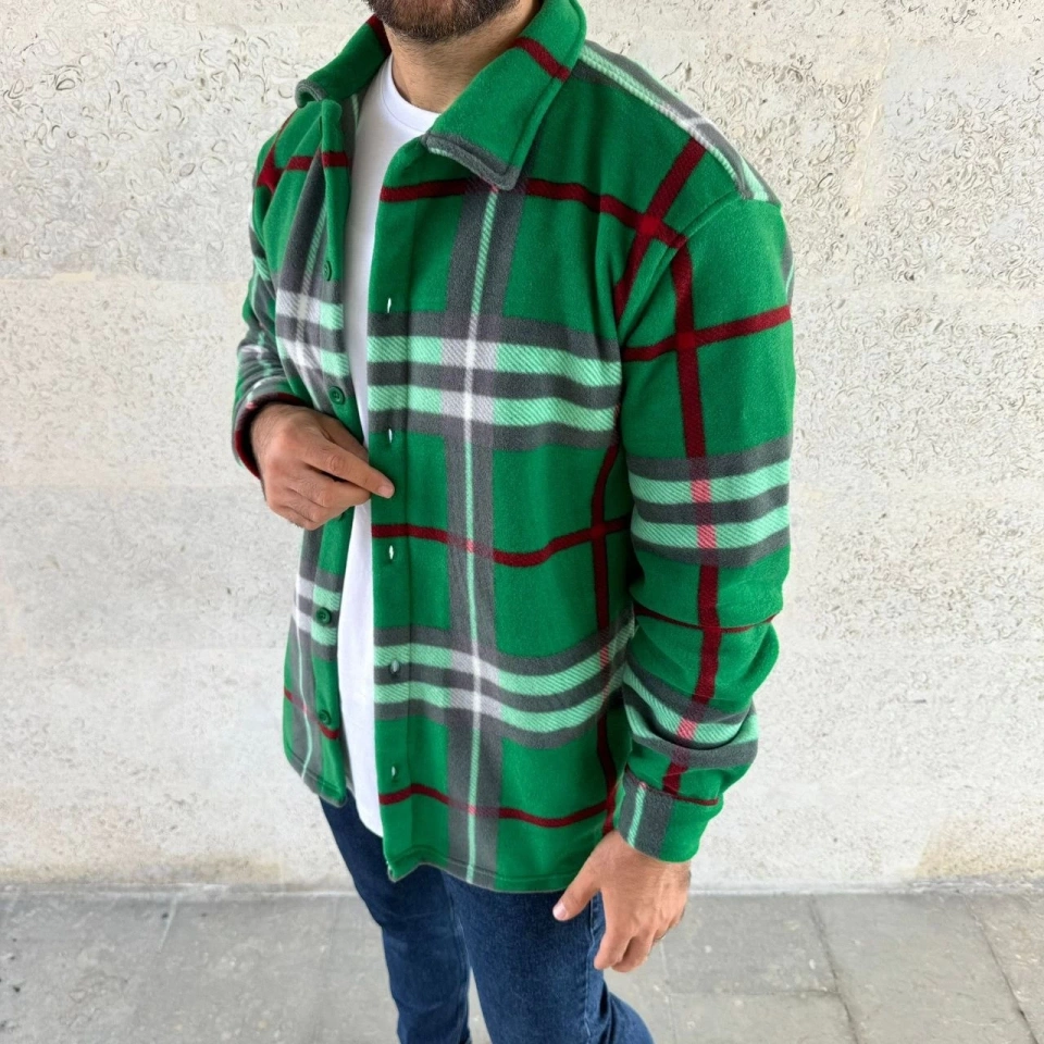 Erkek Ekose Desenli Düğmeli Polar Yakalı Uzun Kollu Gömlek Oversize Rahat Kalıp - Yeşil