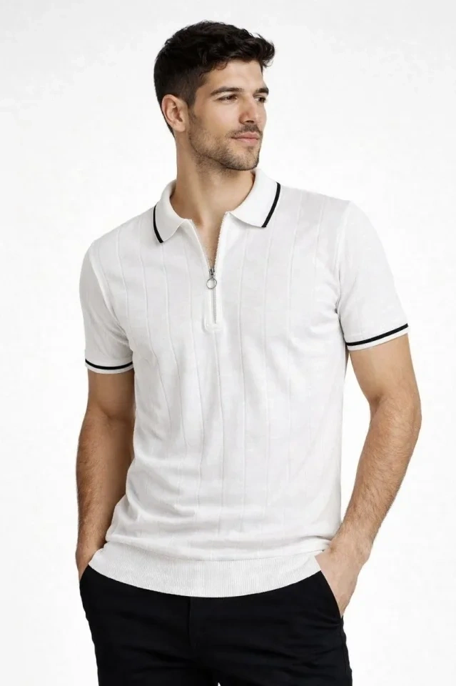 Erkek Fermuarlı Yaka Fitilli Triko Kısa Kollu Regular Fit Tişört T-shirt - Beyaz