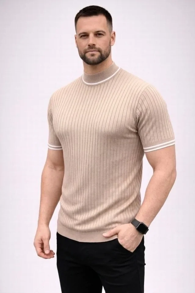 Erkek Fitilli Triko Dokuma Kısa Kol Tişört Yarım Boğaz Modern Yazlık T-Shirt - Bej
