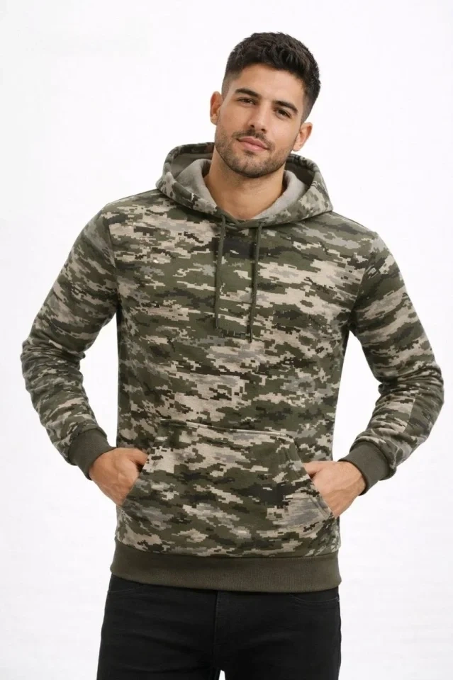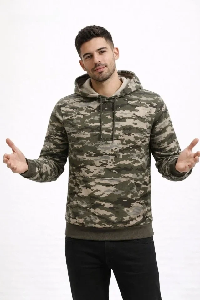 Erkek Kamuflaj Desenli 2 İplik 4 Mevsim Kapüşonlu Kanguru Cepli Hoodie Sweatshirt - Kamuflaj