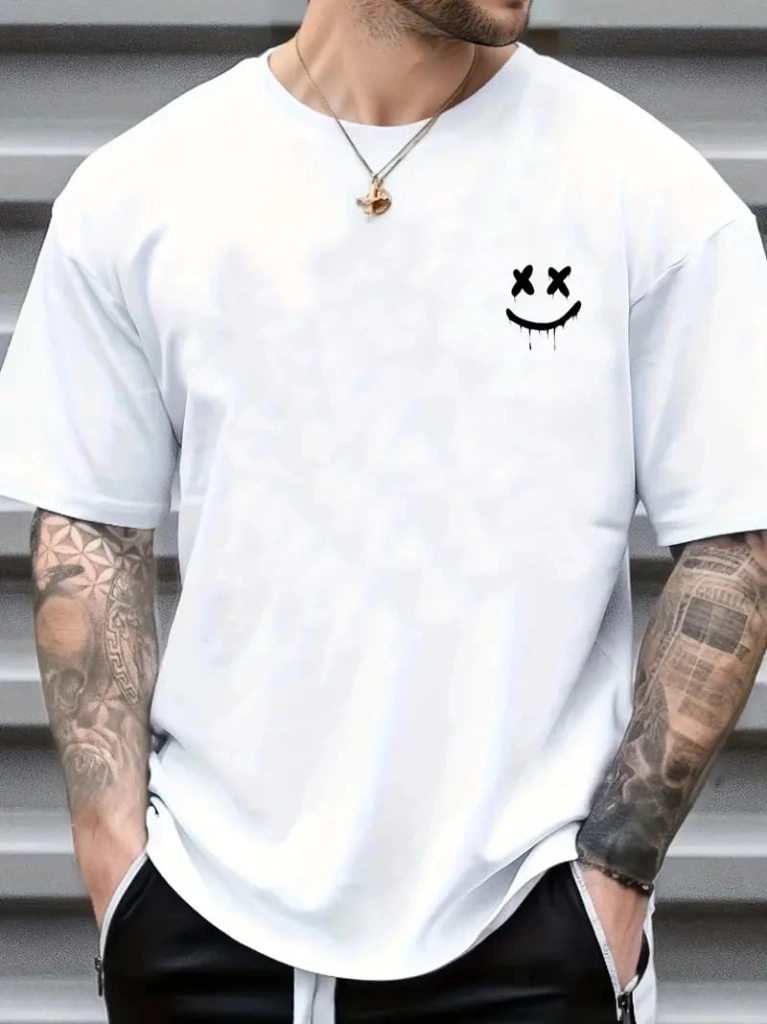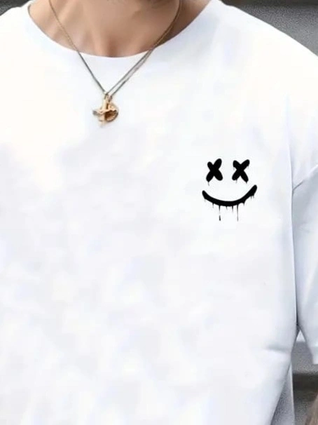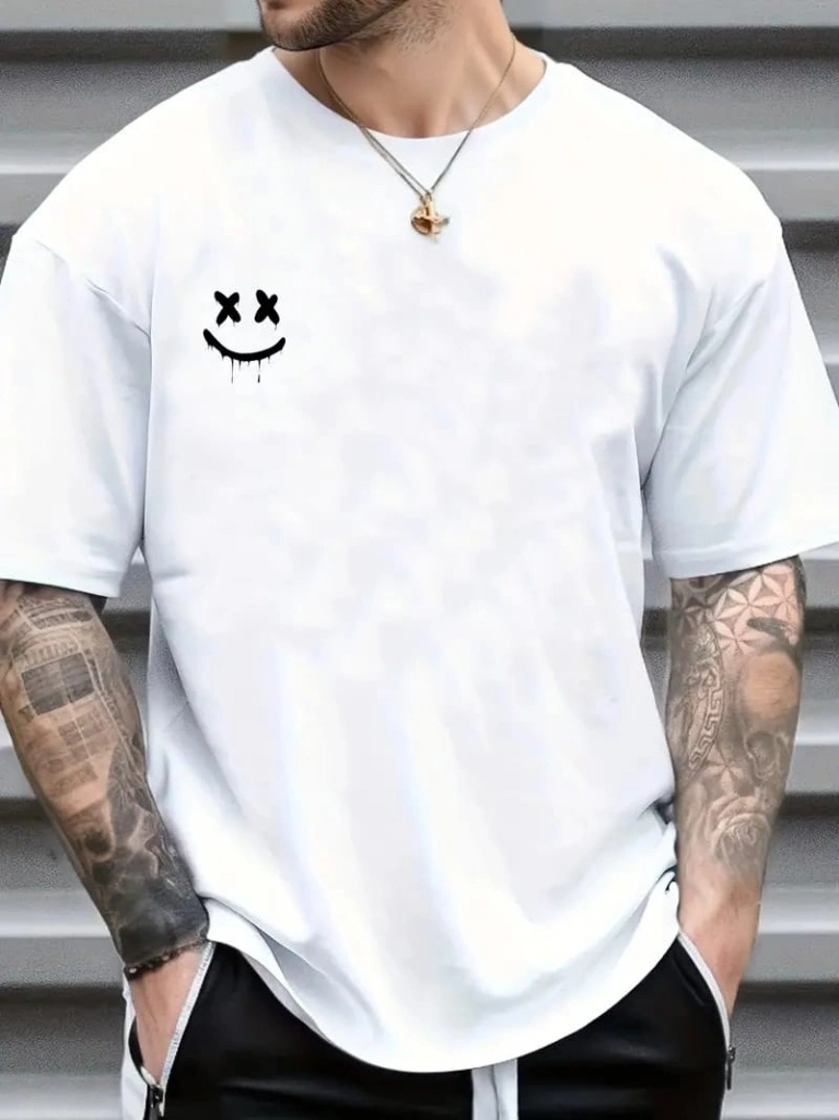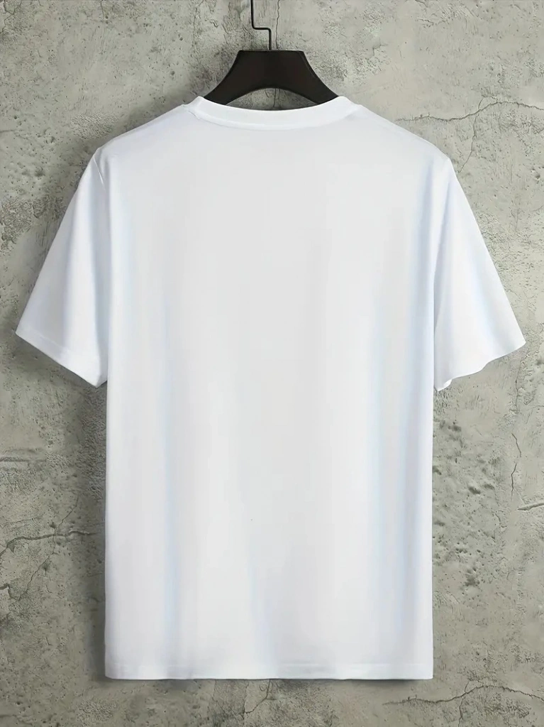 Erkek Bisiklet Yaka Ön Baskılı Kısa Kollu Tişört Streetwear Günlük Basic Pamuklu T-shirt - Beyaz