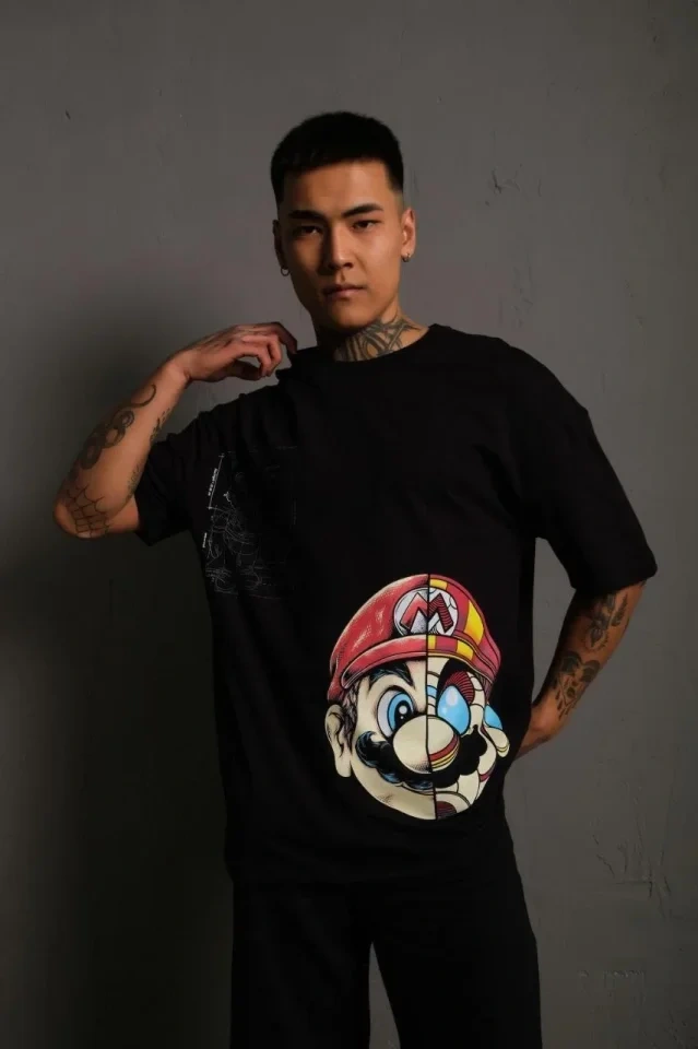 Erkek Mario Baskılı Oversize T-Shirt - Siyah
