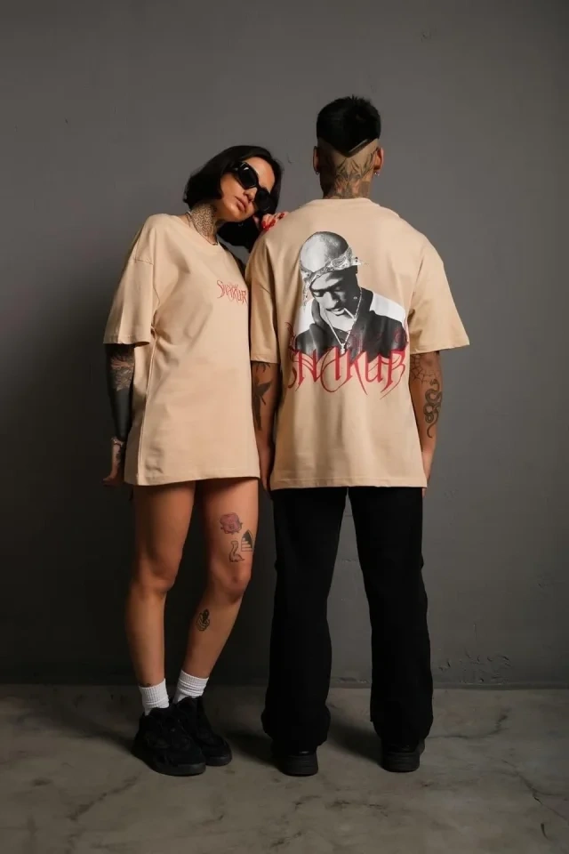 Erkek Oversize Tişört – Beyaz 24/1 Penye Kumaş, Bisiklet Yaka, Ön - Arka Baskılı, Streetwear Tarzı Rahat Büyük Kalıp T-Shirt - Bej