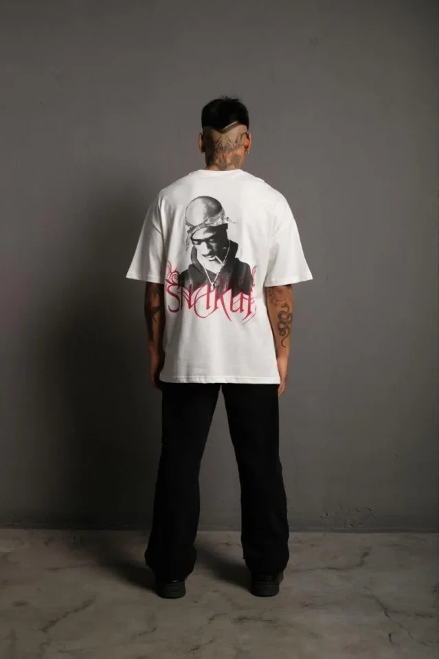 Erkek Oversize Tişört – Beyaz 24/1 Penye Kumaş, Bisiklet Yaka, Ön - Arka Baskılı, Streetwear Tarzı Rahat Büyük Kalıp T-Shirt- Beyaz