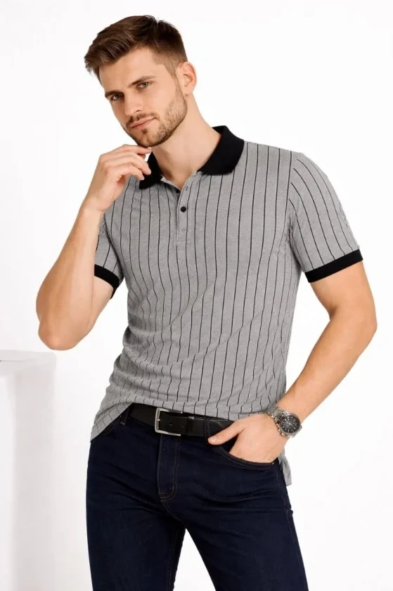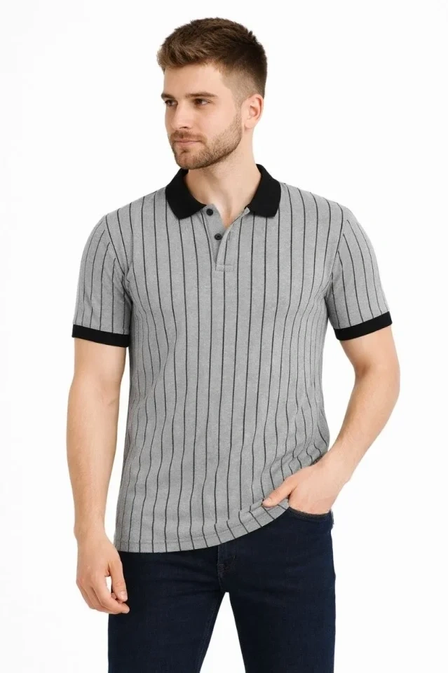 Erkek Polo Yaka Çizgili Tişört Kısa Kol Düğmeli Yazlık T-Shirt - Gri