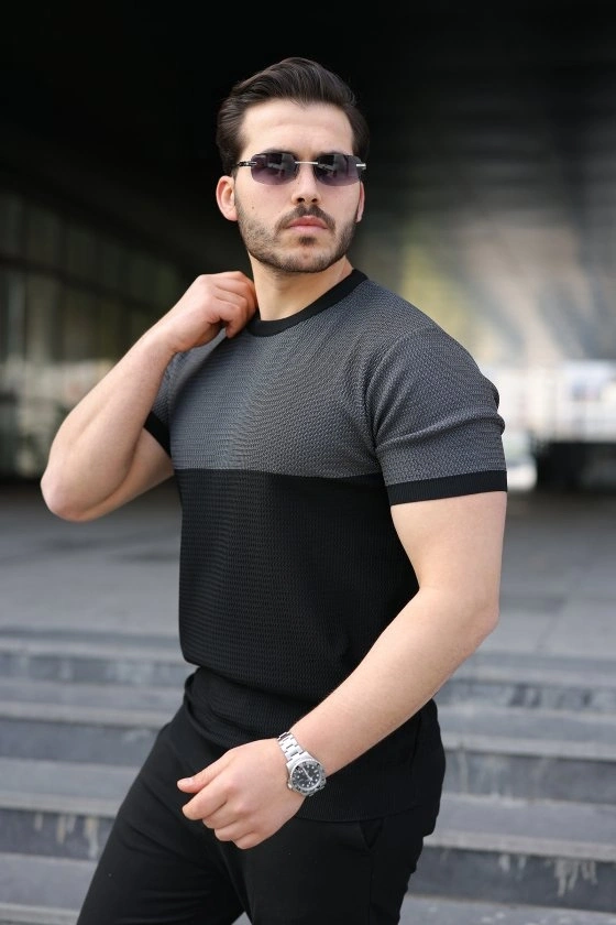 Erkek Renk Bloklu Bisiklet Yaka Kısa Kollu Triko Tişört