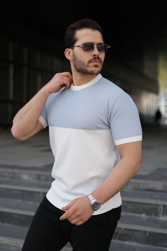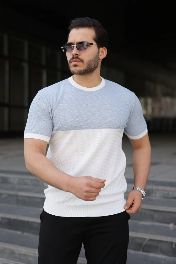 Erkek Renk Bloklu Bisiklet Yaka Kısa Kollu Triko Tişört