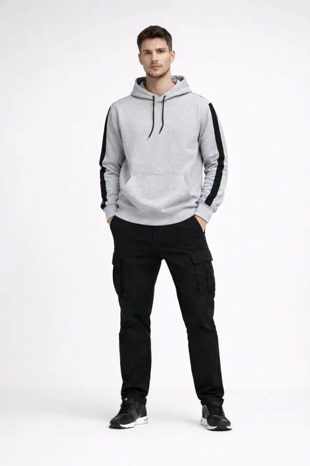 Erkek Şeritli Kapüşonlu Sweatshirt Oversize 3 Iplik Pamuklu - Siyah