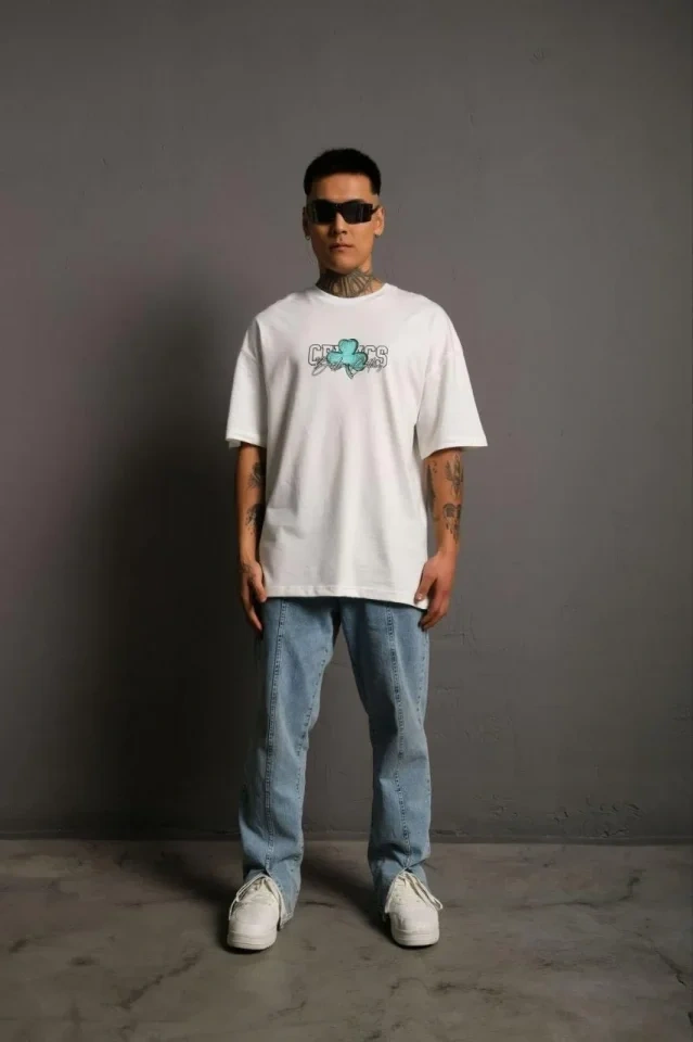 Erkek Oversize Tişört – Beyaz 24/1 Penye Kumaş, Bisiklet Yaka, Ön - Arka Baskılı, Streetwear Tarzı Rahat Büyük Kalıp T-Shirt- Beyaz