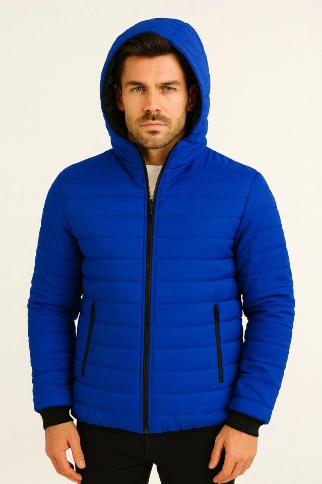 Erkek Şişme Kapüşonlu Fermuarlı Mont Su Itici Kapitone Astarlı Kumaş Cepli Kışlık Rahat Kalıp - Saks Mavisi