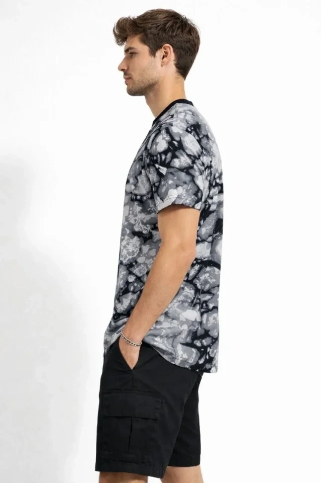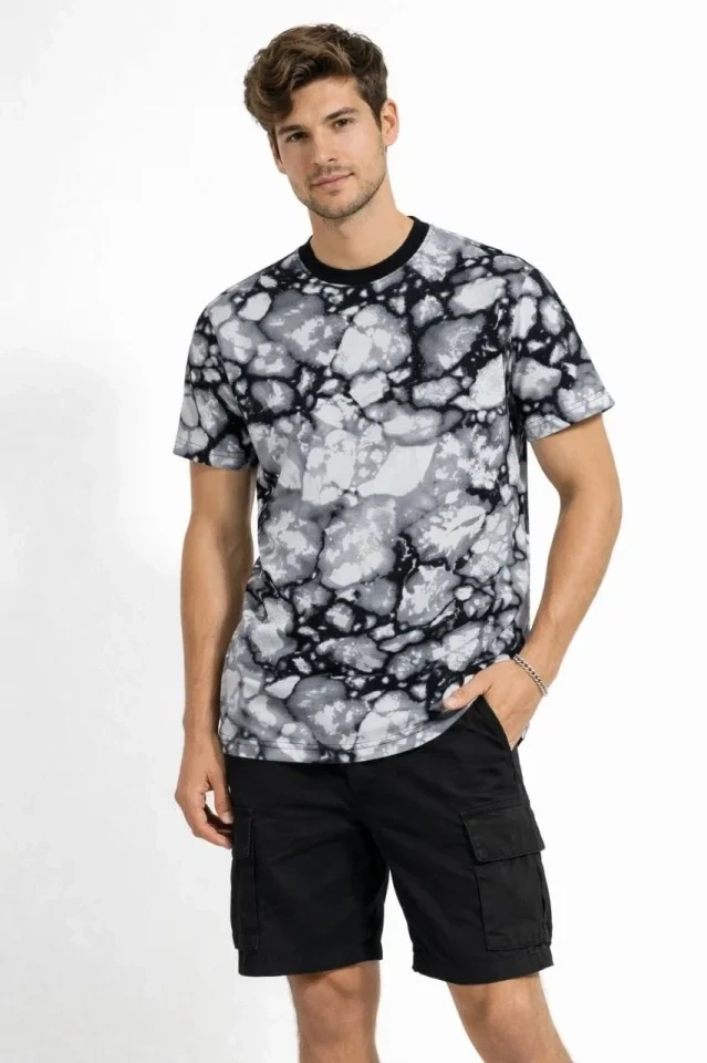 Erkek Siyah Gri Taş Desenli Tişört – Regular Fit, Bisiklet Yaka, Dijital Baskılı Modern Tasarım T-Shirt - Siyah
