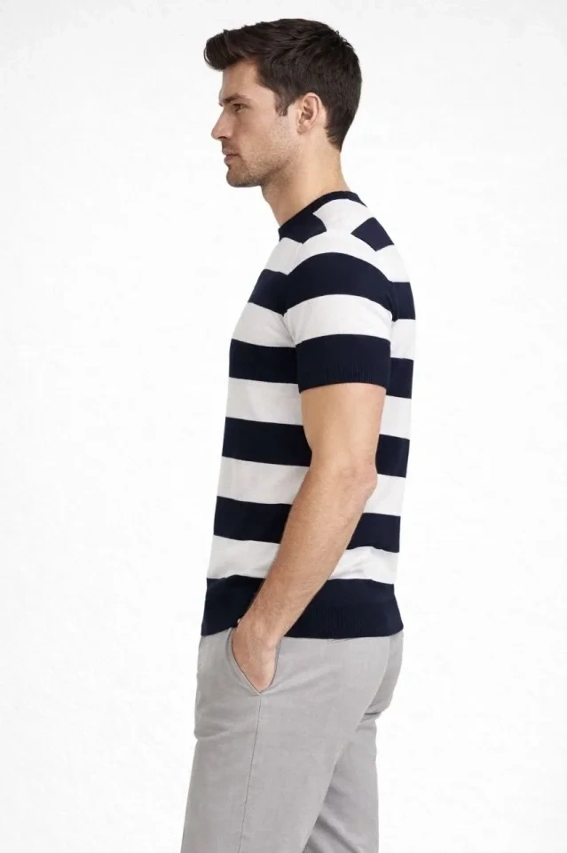Erkek T-shirt Çizgili Triko Dokuma Bisiklet Yaka Tişört - Siyah