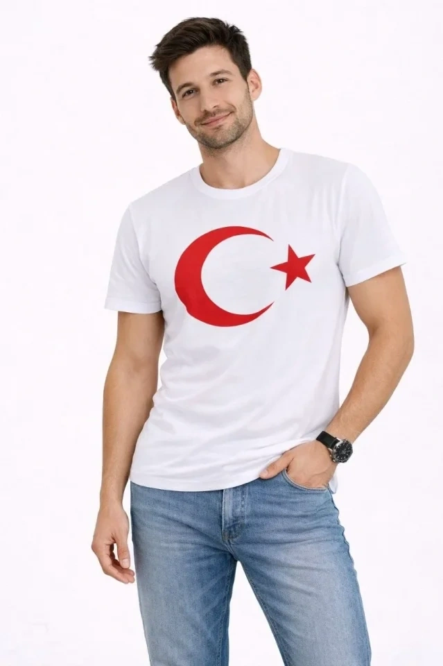 Erkek T-Shirt Kısa Kol Bisiklet Yaka Ay Yıldız Bayrak Baskılı Tişört - Beyaz
